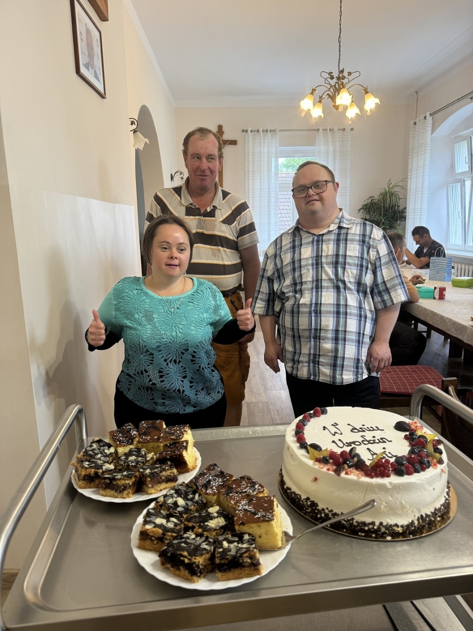 W tym miesiącu obchodziliśmy również w ramach rehabilitacji społecznej piękne podwójne 40-urodziny solenizanta Dariusza z miesiąca lipiec oraz solenizantki Majki z miesiąca wrzesień. Oprócz okrągłych urodzin świętowaliśmy urodziny koleżanek i kolegów oraz personelu z miesiąca lipiec, sierpień i wrzesień: Ani O., Tomka K., Marcina, Andrzeja, Marka, Łukasza, pani Sandry oraz pana Krzysztofa. W imieniu uczestników i pracowników życzymy Wam jeszcze raz samych pogodnych dni, entuzjazmu, sukcesów w życiu oraz dobrego humoru na co dzień. Z całego serca dziękujemy za pyszne torty, ciasta i owoce -100 lat!!!